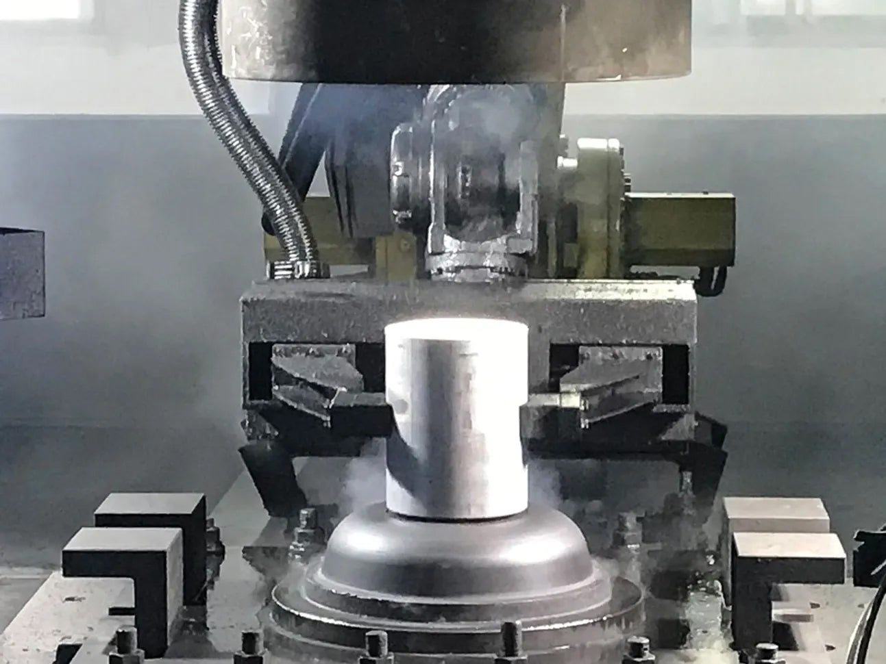当社の新しい鍛造素材は、加工前で最大120ポンド(約54kg)もの重量があります。これほど厚いブランクを成形するためには、10,000メトリックトンの圧力に対応できる特殊な設備が必要です。この極限の圧力によって、アルミニウム内部の巣(ポロシティ)を除去し、結晶粒の構造を改善することで強度を高めています。