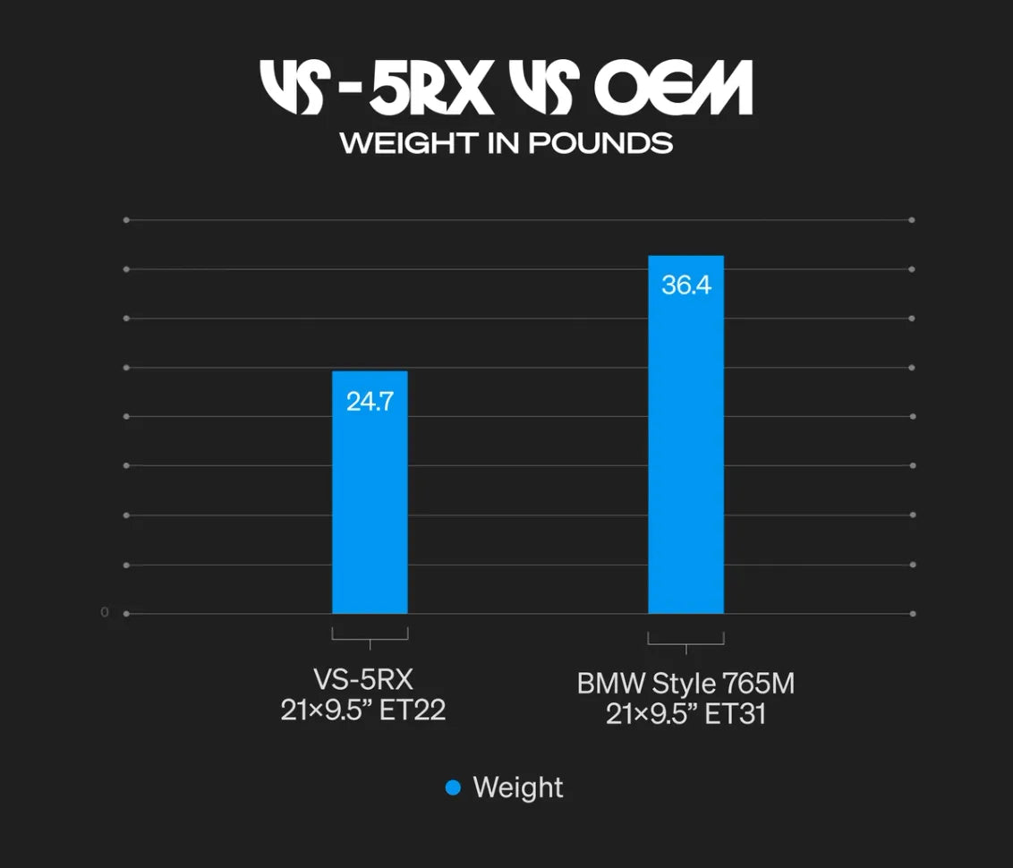 VS-5RXは純正ホイールに比べて約11ポンド(約5kg)以上軽量化されることが多く、SUVやEVカテゴリーにおける真のゲームチェンジャーです。約45ポンド(約20kg)のバネ下回転質量を削減することで、加速・制動・ハンドリングだけでなく燃費や航続距離も大幅に向上します。