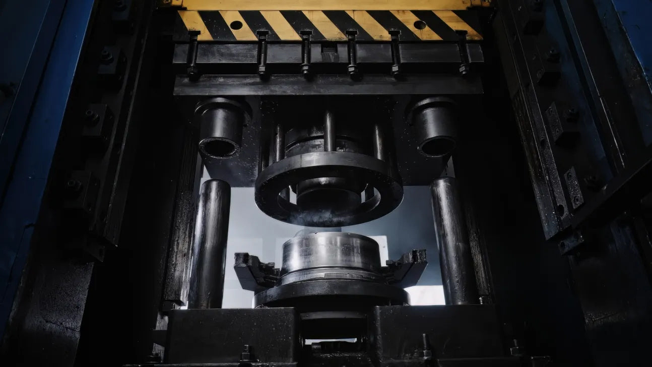 鍛造ホイールを最大限に強固にするため、10,000トンプレスを使用。この極限の圧力によりアルミ内部の巣を除去し、結晶構造を改善して強度を高めています。