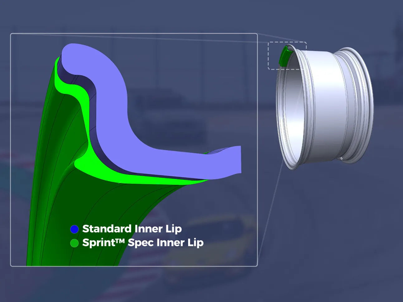 Sprint™仕様のインナーリップは、独自のチャンネルプロファイルを採用し、従来の設計よりもさらに強化されています。そのため、Sprint™ホイールは同等のフローフォームホイールよりも数ポンド軽量でありながら、インナーリップの強度を高めています。