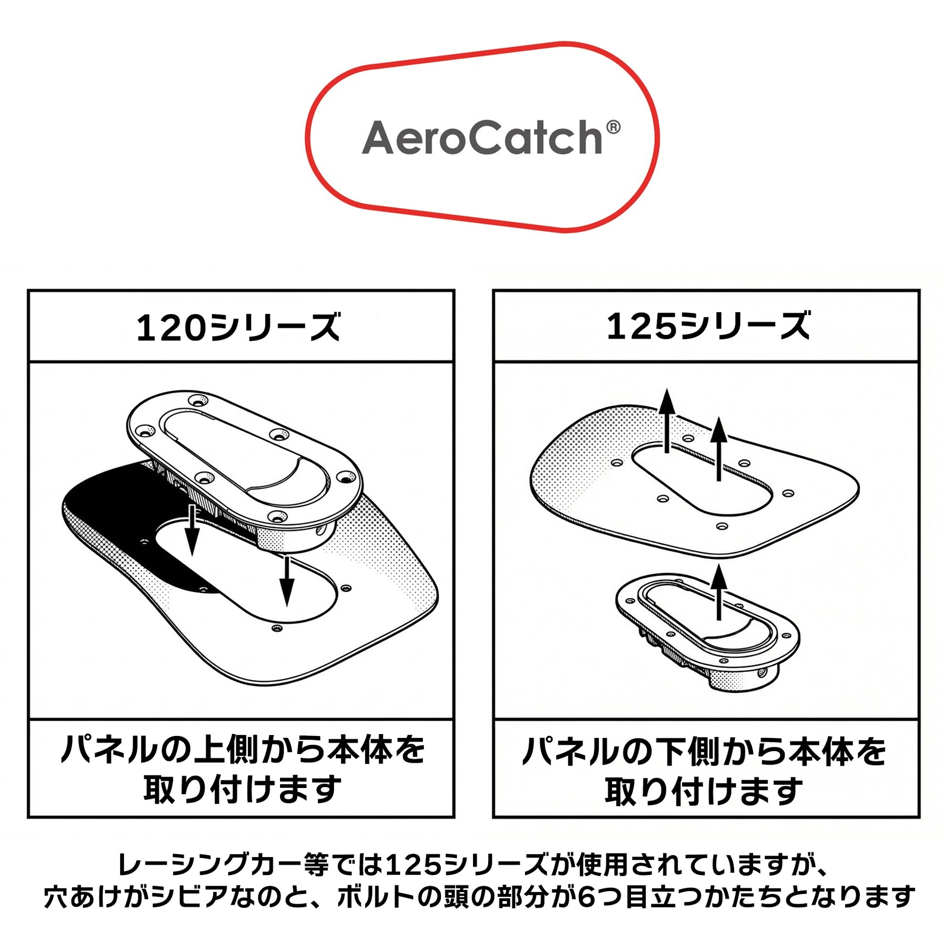 世界中のモータースポーツシーンで信頼される「AeroCatch(エアロキャッチ)」の120シリーズ 上面取り付け(Above Panel)Xtremeモデルです。 市場に溢れる粗悪なコピー品とは一線を画す、エアロキャッチの開発元であるイギリスSFC(Specialized Fastener Company)社製の正規品をお届けします。