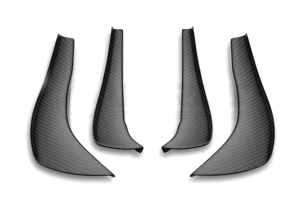 シボレー・コルベット(C8)の空力性能を次のレベルへと引き上げる、カーボン製のデュアルダイブプレーン(カナード)キットです。ドラッグの増加を最小限に抑えつつ、フロントダウンフォースを増加させるよう精密に設計されています。上下2段のユニットが相互に作用し、フロントアクスルへの接地感をもたらすだけでなく、ホイールハウス内の空気を排出する補助的な役割も果たします。